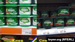 Фотографії прилавків з продуктами та цінами розташовані поруч, ліворуч – супермаркет у Києві, праворуч – у Сімферополі. Щоб не було помилок, фотографії підписані і помічені кольорами прапорів України та Криму.