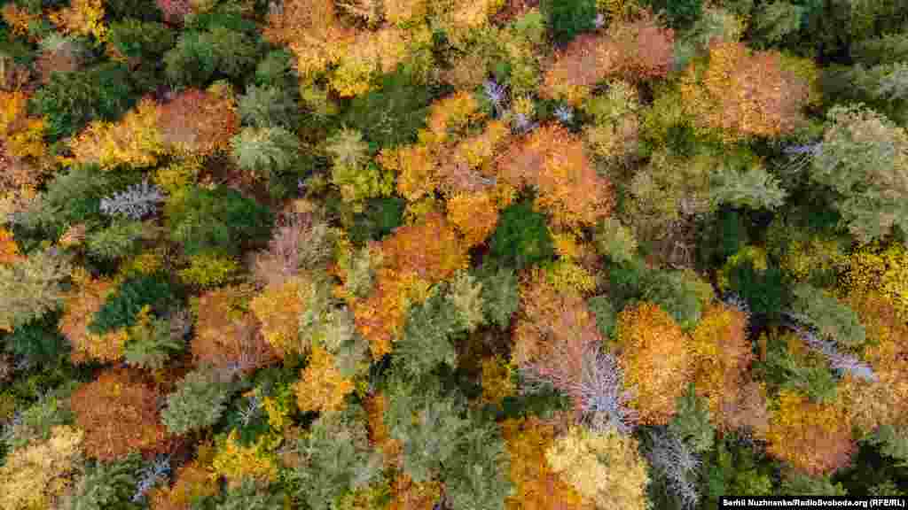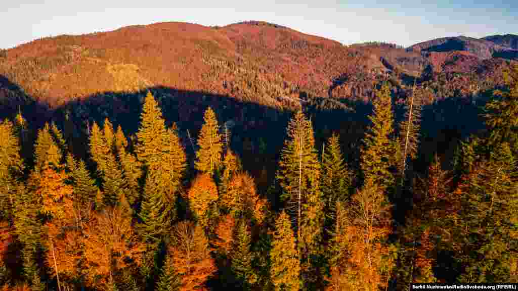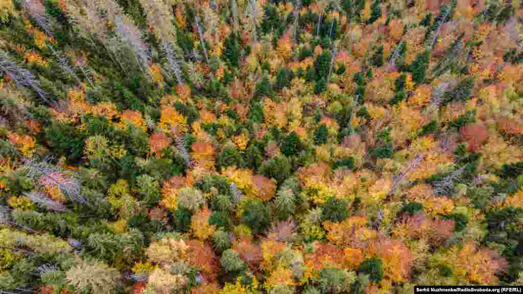 Відтінки осінніх Карпат неподалік від містечка Славське, Львівської області на фото з дрону.