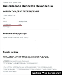 Тоді ж журналістка шукала роботу на сайтах із працевлаштування, вказуючи, що готова переїхати до Києва. Одне з оголошень від її імені досі збереглося у відкритому доступі.