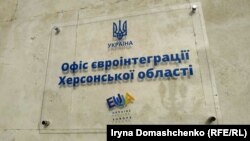 Новенька табличка на фасаді будівлі Херсонської облдержадміністрації. Тут, в одному з приміщень на першому поверсі, і розташували Офіс євроінтеграції Херсонської області, точніше його повна назва – «Агенція регіонального розвитку «Офіс євроінтеграції» Херсонської області».